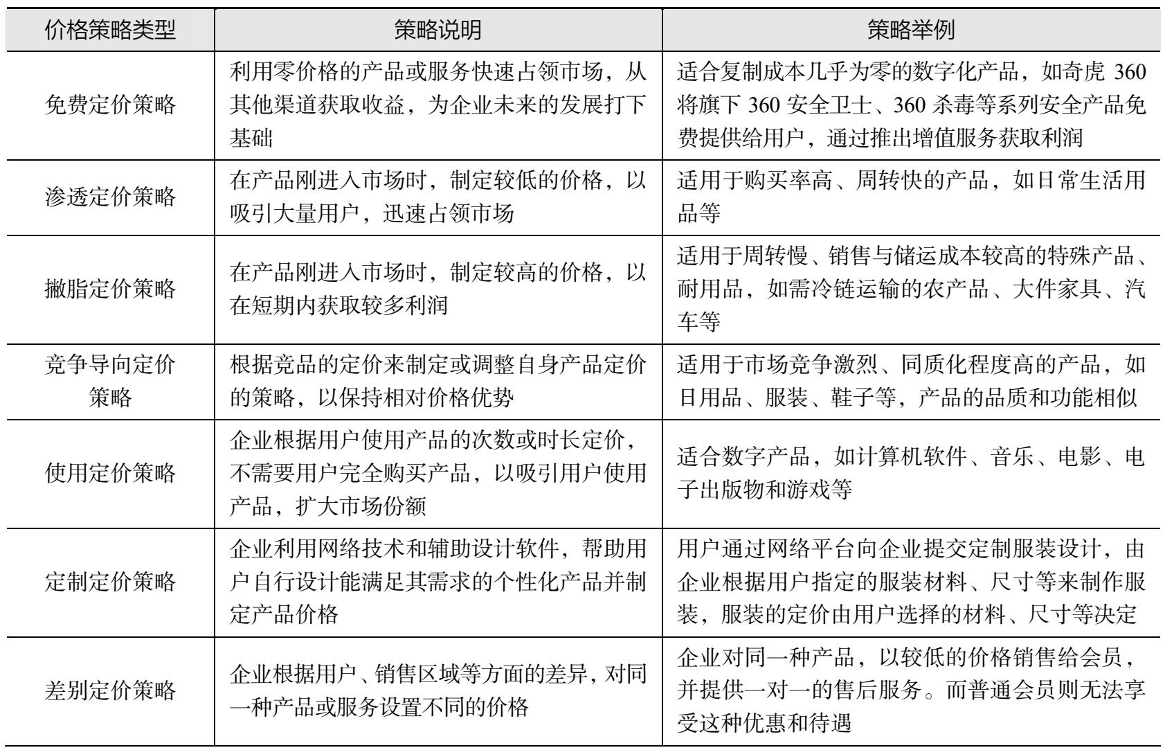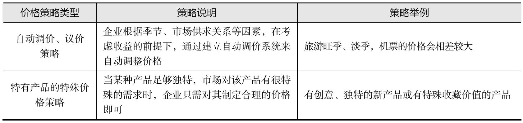 价格策略是企业设定和调整产品价格所运用的策略。在网络营销环境下,价格是公开透明的,用户可以同时知晓某种产品的多个甚至全部厂家的销售价格。企业要想在价格上取胜,就需要以不同的产品定价吸引用户。常见的网络营销价格策略如表1-2所示。