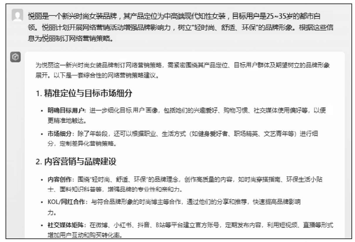 (3)确定指令。根据使用目的、营销目的,结合项目背景中的产品定位、目标用户等关键信息形成具体指令,如“悦丽是一个新兴时尚女装品牌,其产品定位为中高端现代知性女装,目标用户是25~35岁的都市白领。悦丽计划开展网络营销活动增强品牌影响力,树立“轻时尚、舒适、环保”的品牌形象。根据这些信息为悦丽制订网络营销策略。”