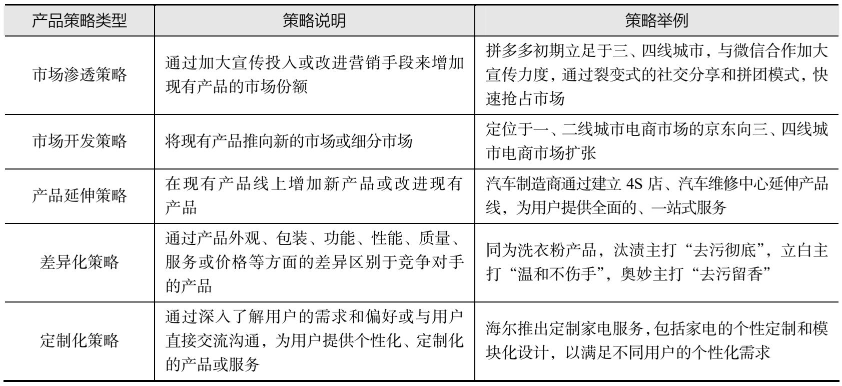 产品策略是企业在生产、包装、销售产品时所运用的策略。网络营销在一定程度上降低了营销及相关业务管理的成本费用,也为企业制订产品策略提供了更多选择。常见的网络营销产品策略如表1-1所示。