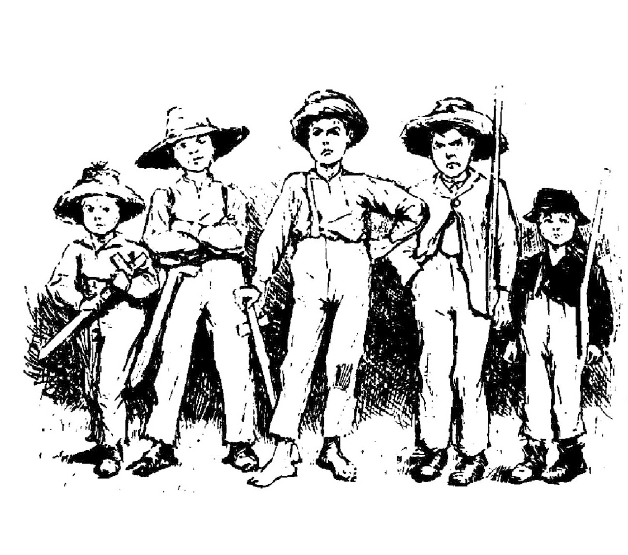 “啊,我们这个强盗帮就在这里成立啦。我们给它起个名字,就叫它汤姆·索亚帮吧。凡是有心参加的,都得起个誓,还要用血写下自己的名字。”