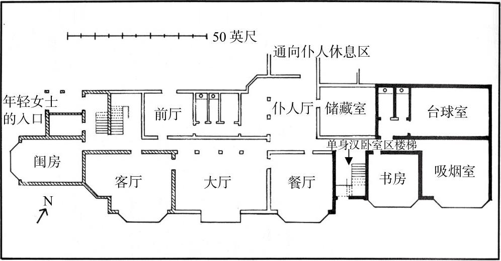 图2.1 英国阿贝斯特德(Abbeystead)的塞夫顿伯爵(Earl of Sefton)的乡村别墅平面图,其中包括按性别划分的住宅区域。注意图中有一个通向单身汉卧室区的单独楼梯。[图片来源:Mark Girouard,Life in the English Country House:A Social and Architectural History(New Haven,CT:Yale University Press,1978),298.]