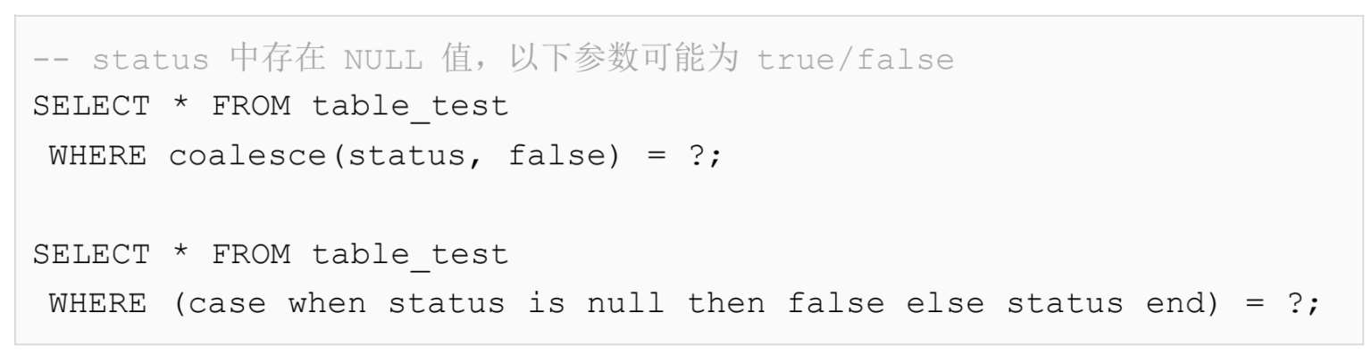 那如果我们需要根据status(包含NULL值,NULL时默认false)来查询,参数值可能是true/false,则可以表达为coalesce(status, false),当status为NULL时,自然返回的就是后边的false。