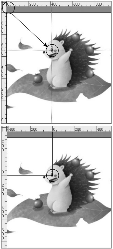 标尺显示于文档窗口的顶部与左侧,可精准定位和度量文档和画板中的对象。标尺原点显示的数值为(0,0),标尺原点是可以改变的,拖曳原点即可进行修改,如图1-78所示。如果想要恢复标尺原点的默认设置,那么可以双击水平标尺和垂直标尺的交会处,如图1-79所示。