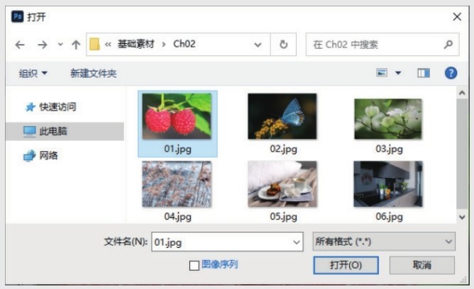 如果要对照片或图片进行修改或处理,需要在Photoshop中打开所需的文件。