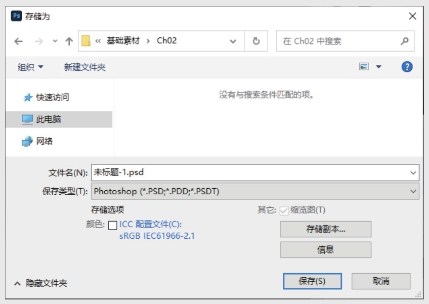 选择“文件>存储”命令,或按Ctrl+S组合键,可以存储文件。当对设计好的作品进行第一次存储时,选择“文件>存储”命令,将弹出“存储为”对话框,如图2-14所示。在对话框中输入文件名、选择保存类型后,单击“保存”按钮,即可将文件保存。