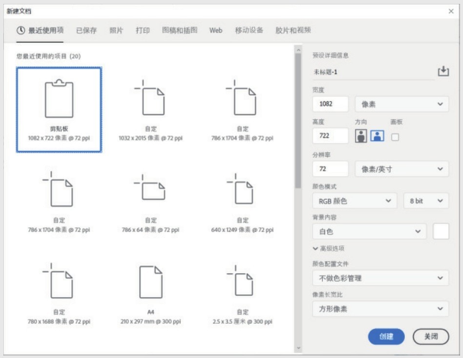 选择“文件>新建”命令,或按Ctrl+N组合键,弹出“新建文档”对话框,如图2-10所示。在对话框中可以设置新建图像的名称、宽度和高度、分辨率、颜色模式等,设置完成后单击“创建”按钮,即可完成文件新建,如图2-11所示。