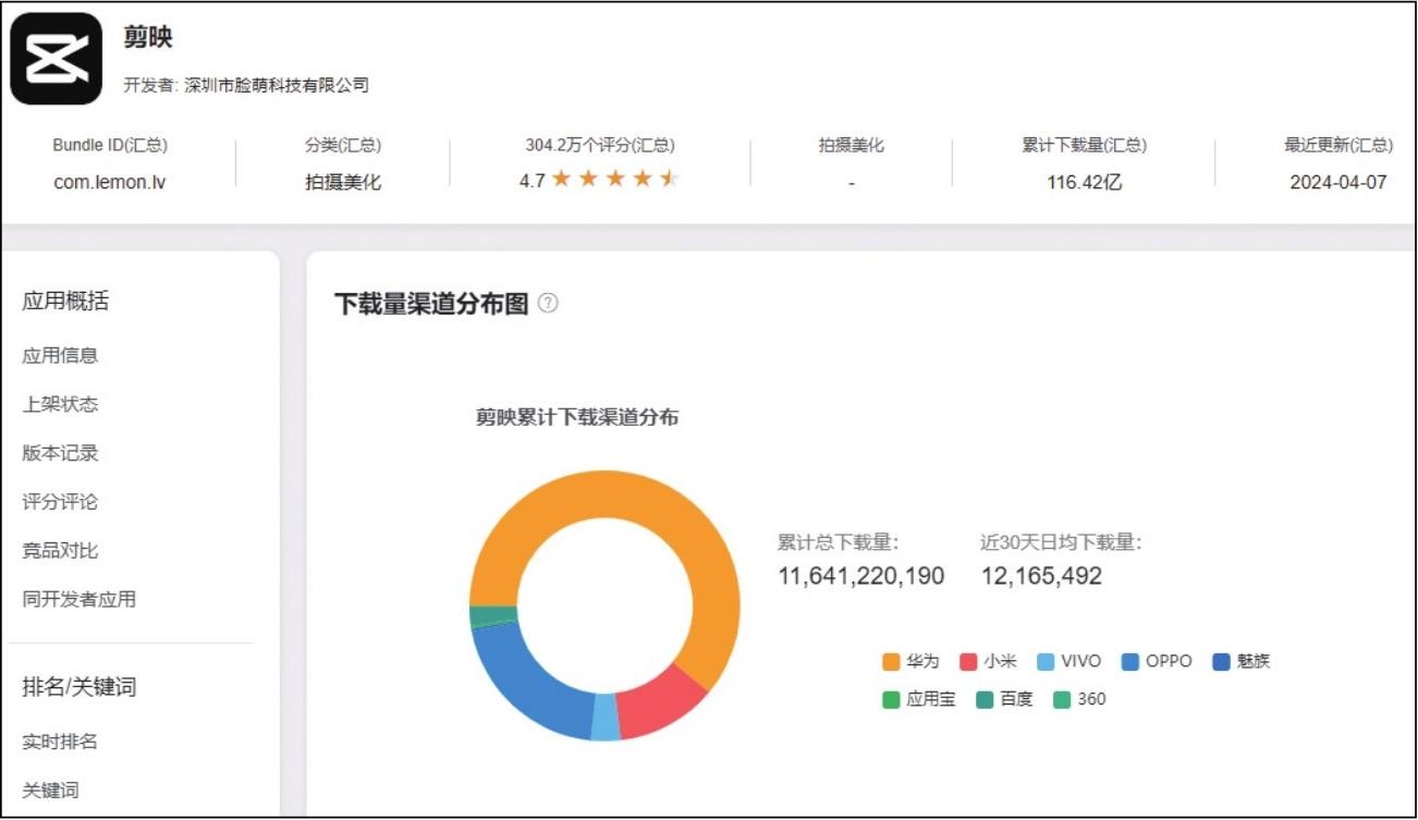 剪映App是抖音于2019年5月推出的一款移动端视频剪辑工具,带有全面的剪辑功能和丰富的曲库资源,拥有多样滤镜和美颜效果,一经上线便深受用户喜爱。据调查,截止到2024年4月,剪映在各平台(国内Android市场)的总下载量高达116.42亿次,如图1-2所示。