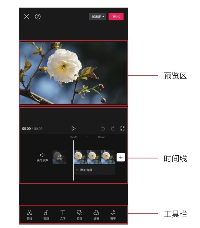 ,进入素材添加界面,在选择相应素材并点击“添加”按钮后,即可进入视频编辑界面,如图1-15所示,该界面由三部分组成,分别为预览区、时间线和工具栏。