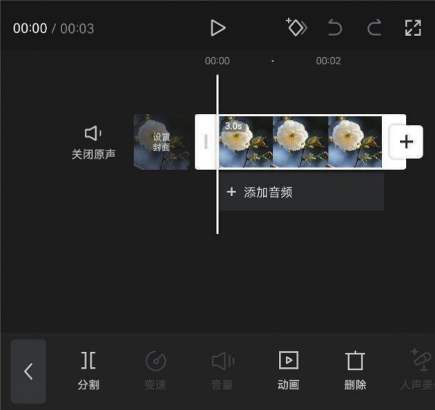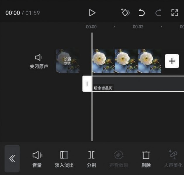需要注意的是,选中某一轨道后,剪映工具栏会随之发生变化,变成与所选轨道相匹配的工具。图1-16所示为选中图像轨道时的工具栏,图1-17所示则为选中音频轨道时的工具栏。