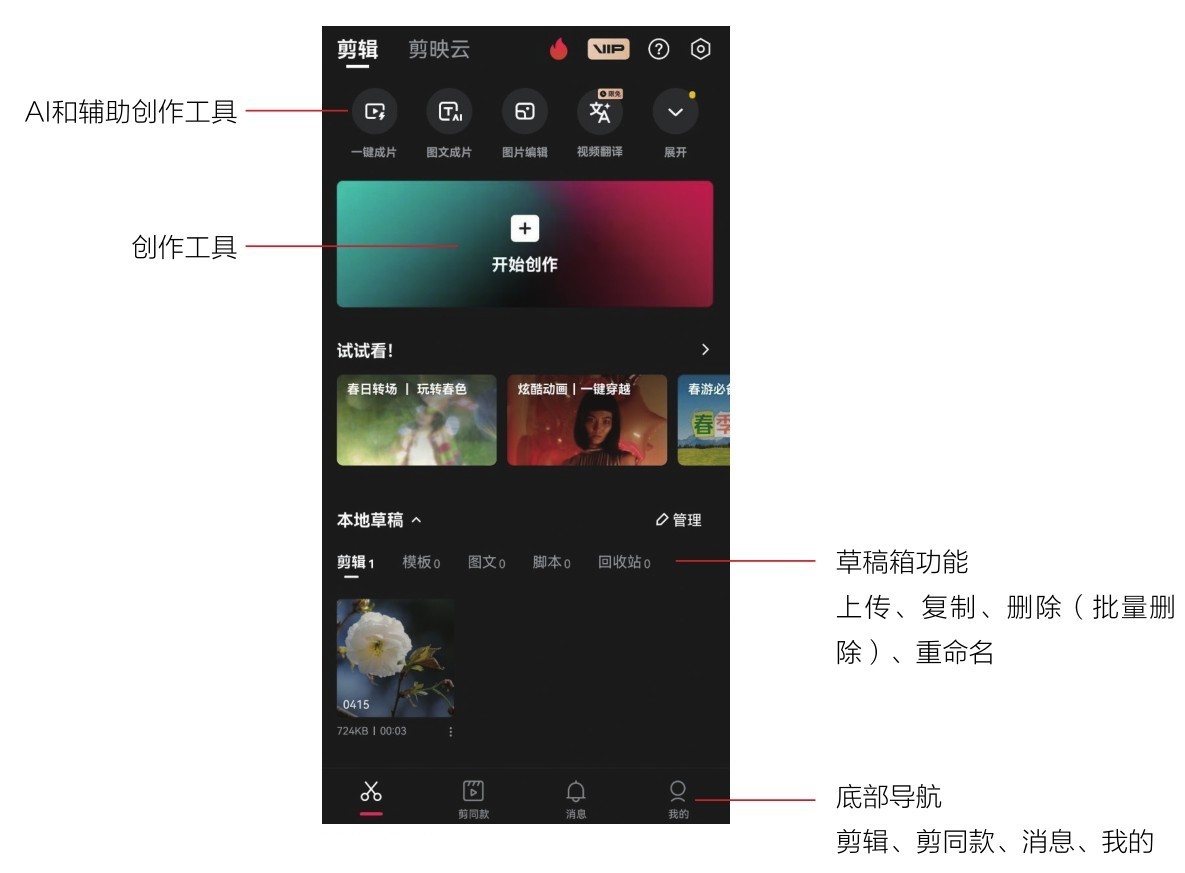 剪映App的工作界面非常简洁明了,各工具按钮下方附有相关文字,用户可以对照文字轻松地管理和制作视频。下面将剪映App的工作界面分为“主界面”和“编辑界面”两个部分分别进行介绍。