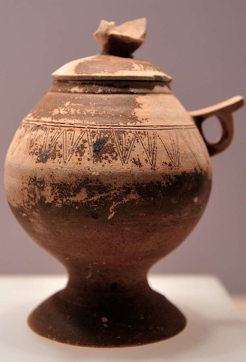 第五期进一步出现用慢轮技术修坯的泥质陶器,纹饰除传统的绳纹、篮纹等编织纹外,新出现式样繁多的刻画纹、戳印纹、捺压纹,如干栏纹、水波纹、曲折纹、网格文、弦纹、乳钉纹、篦点纹、附加堆纹等,器型富于变化,有罐、钵、圈足盘、豆、支脚等器类。