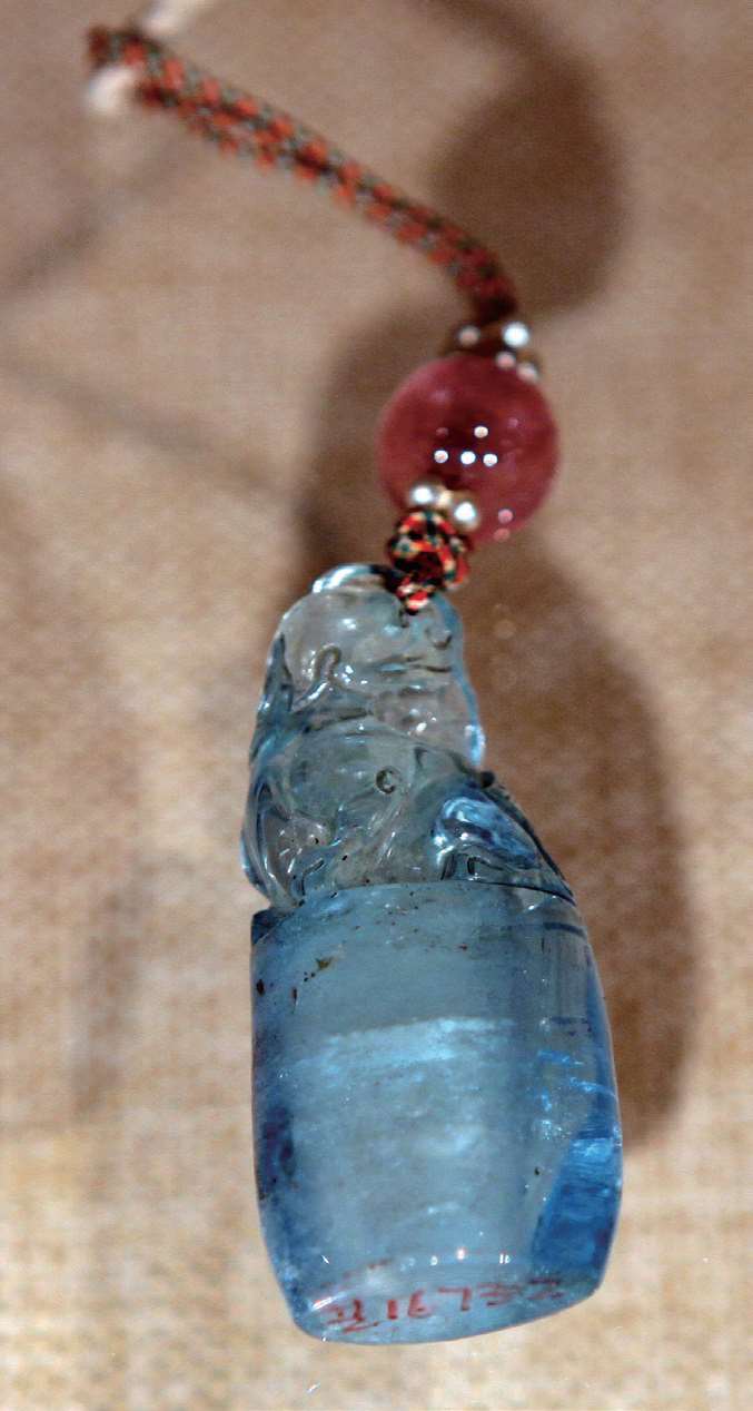 如清代蓝宝石雕坠簪子,高14厘米,珠直径1.2厘米,在畸形珠左边饰一蓝宝石雕琢的宝瓶,瓶口插几枝细细的红珊瑚枝衬托着一个“安”,在当时蓝宝石稀少的情况下,极为罕见。