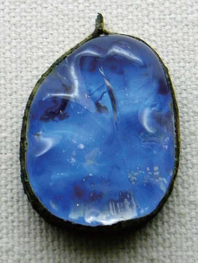 清代蓝宝石蛋形大戒指面,长1.5厘米,宽1.2厘米,厚0.6厘米,重约2.6克,此品保存良好,包浆入骨,蛋形。