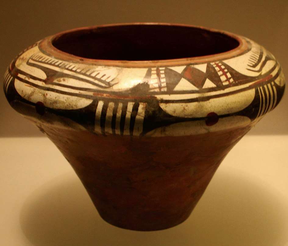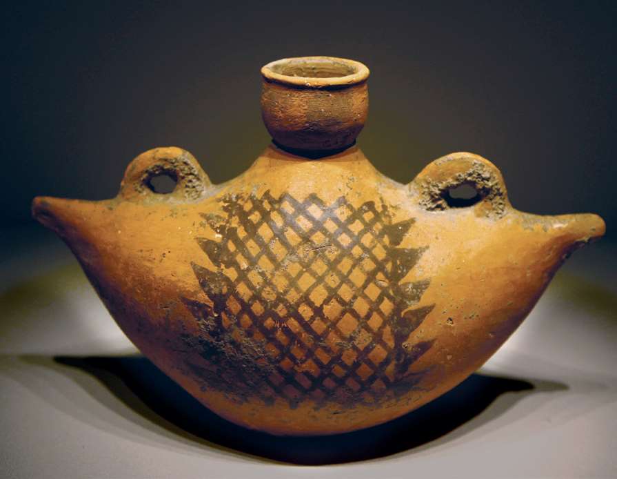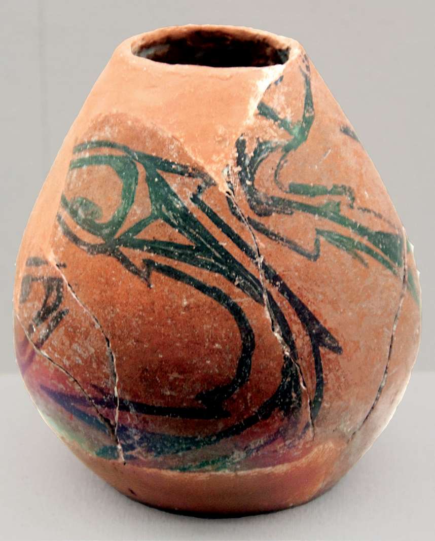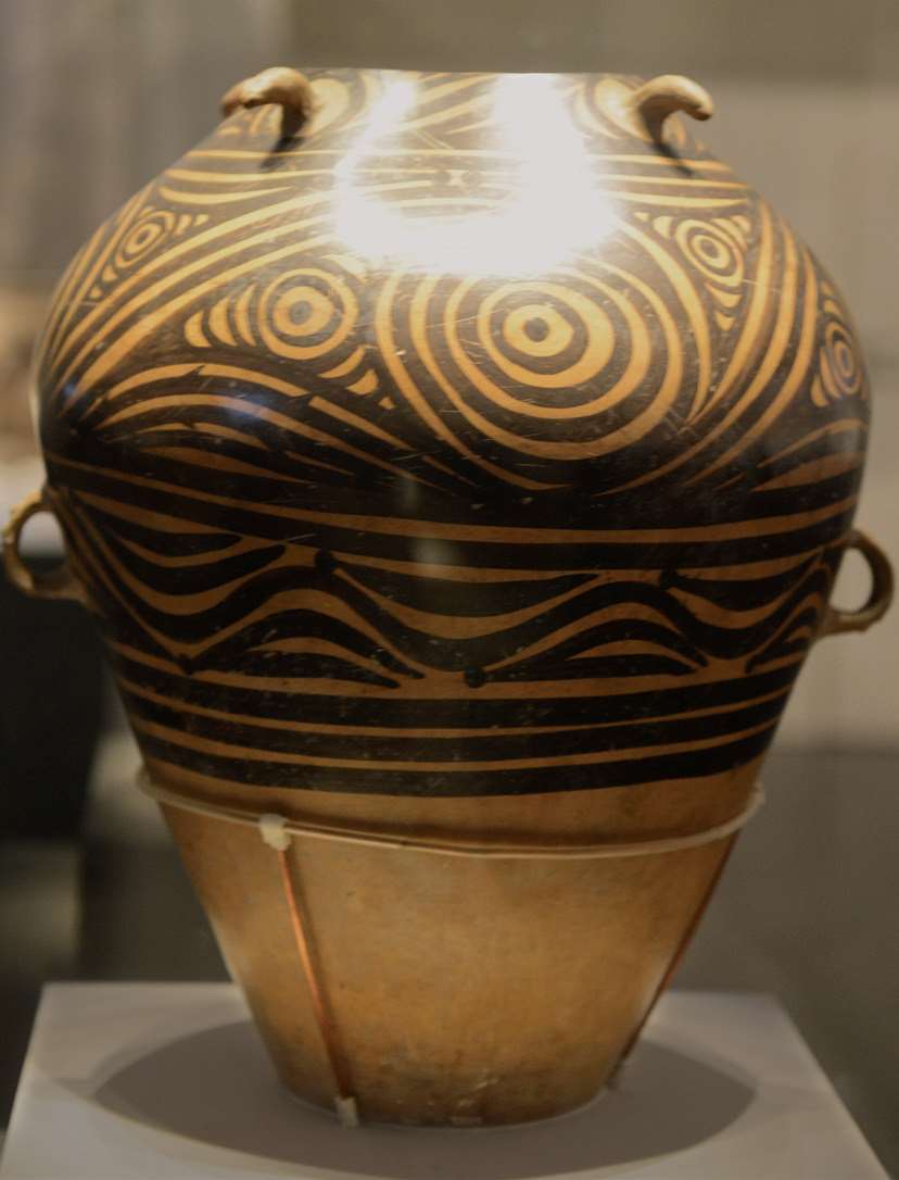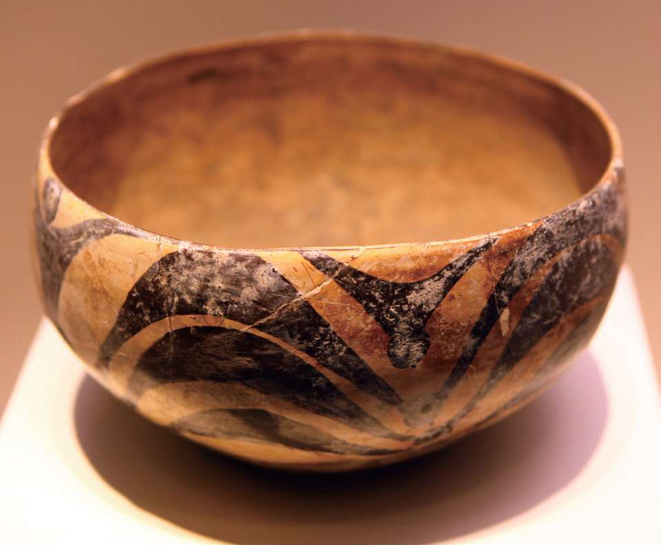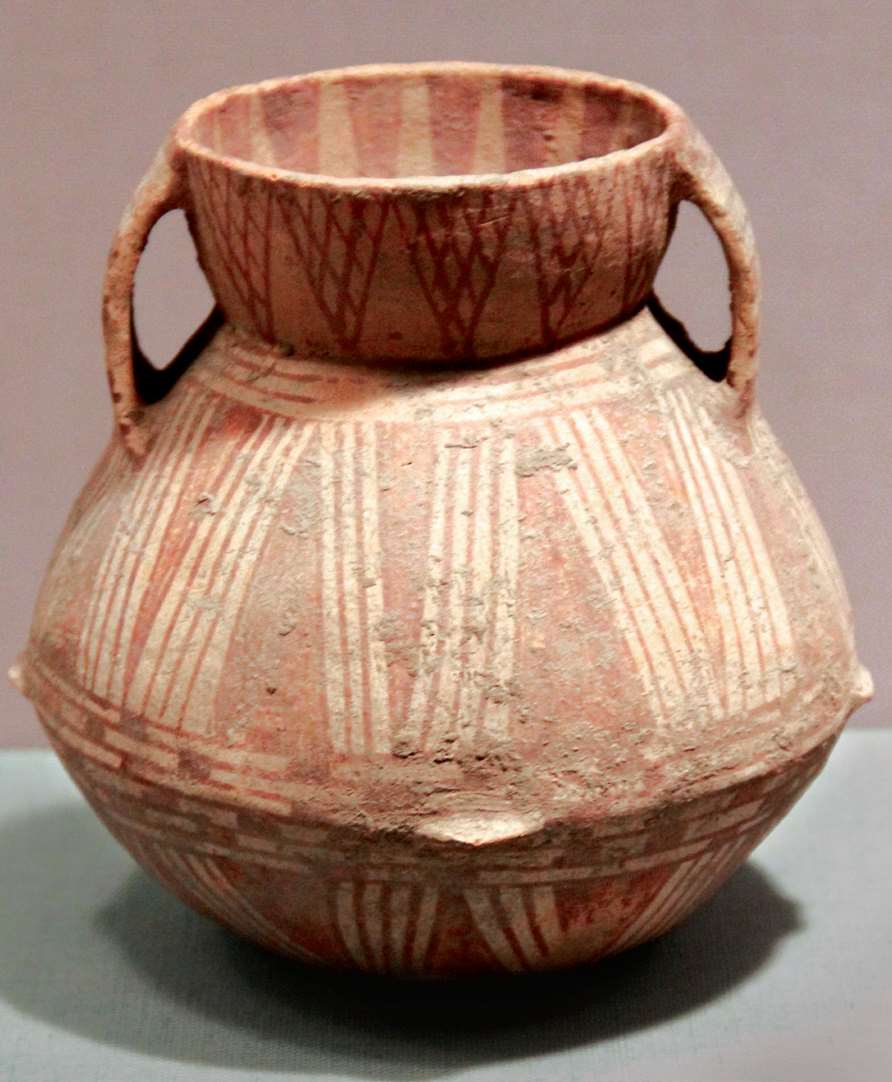 仰韶文化因遗址的陶器,一般是美观的。发展到了属于铜器时代的辛店遗址的陶器,纹饰较为复杂,纹饰间还点缀着犬羊的图形,有的还涂有人形纹。