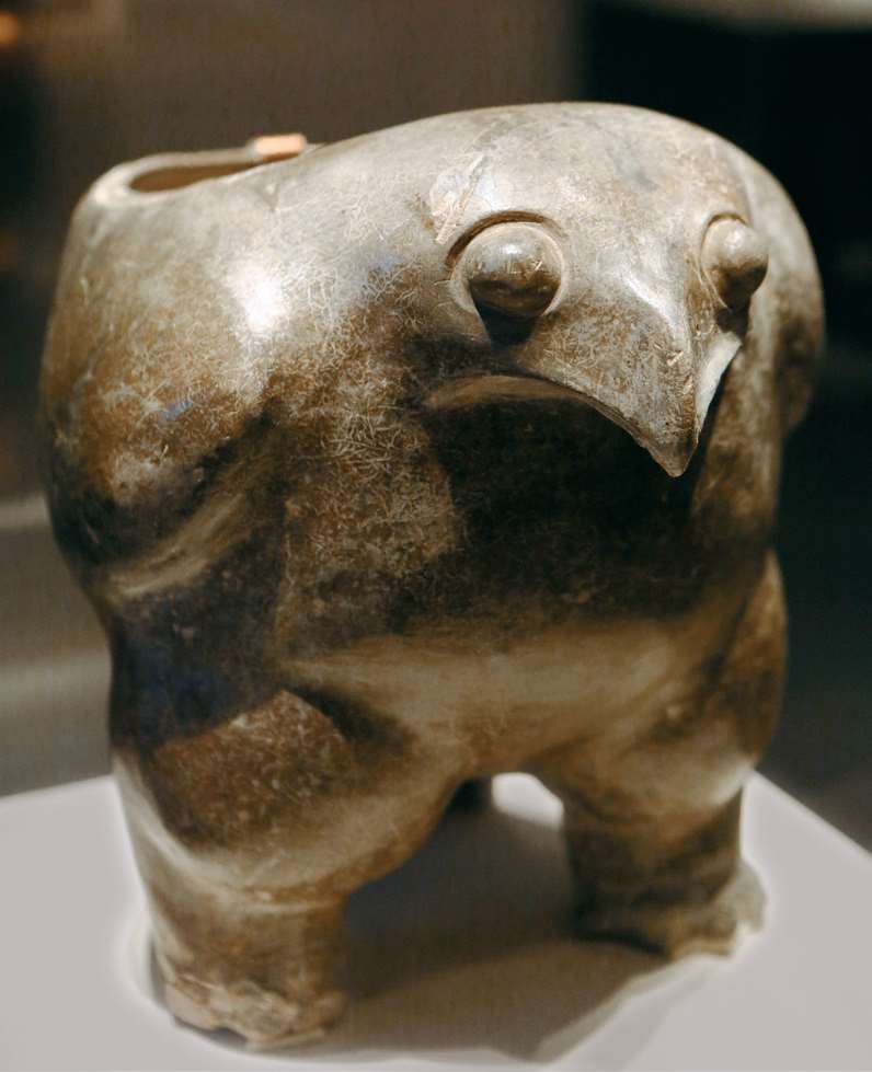 器物造型与猫头鹰的形状浑然一体,如一只蓄势待发的猫头鹰。两只圆圆的大眼炯炯有神,尖尖的嘴巴向下弯成钩形,显得非常犀利,翎羽矗立,身体丰满结实,肌肉隆起,透着一股威猛劲。