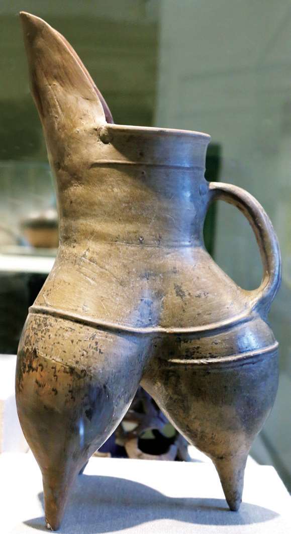 无论从正面观看还是从侧面观看,都给人一种健美的感觉。猫头鹰的两腿空心,尾巴下垂落地,自然地形成“三足鼎立”,既加大了容量,又使其具有稳定性。新石器时期以鸟类造型的陶器十分罕见,黑陶鸮鼎是原始制陶工艺的杰作。