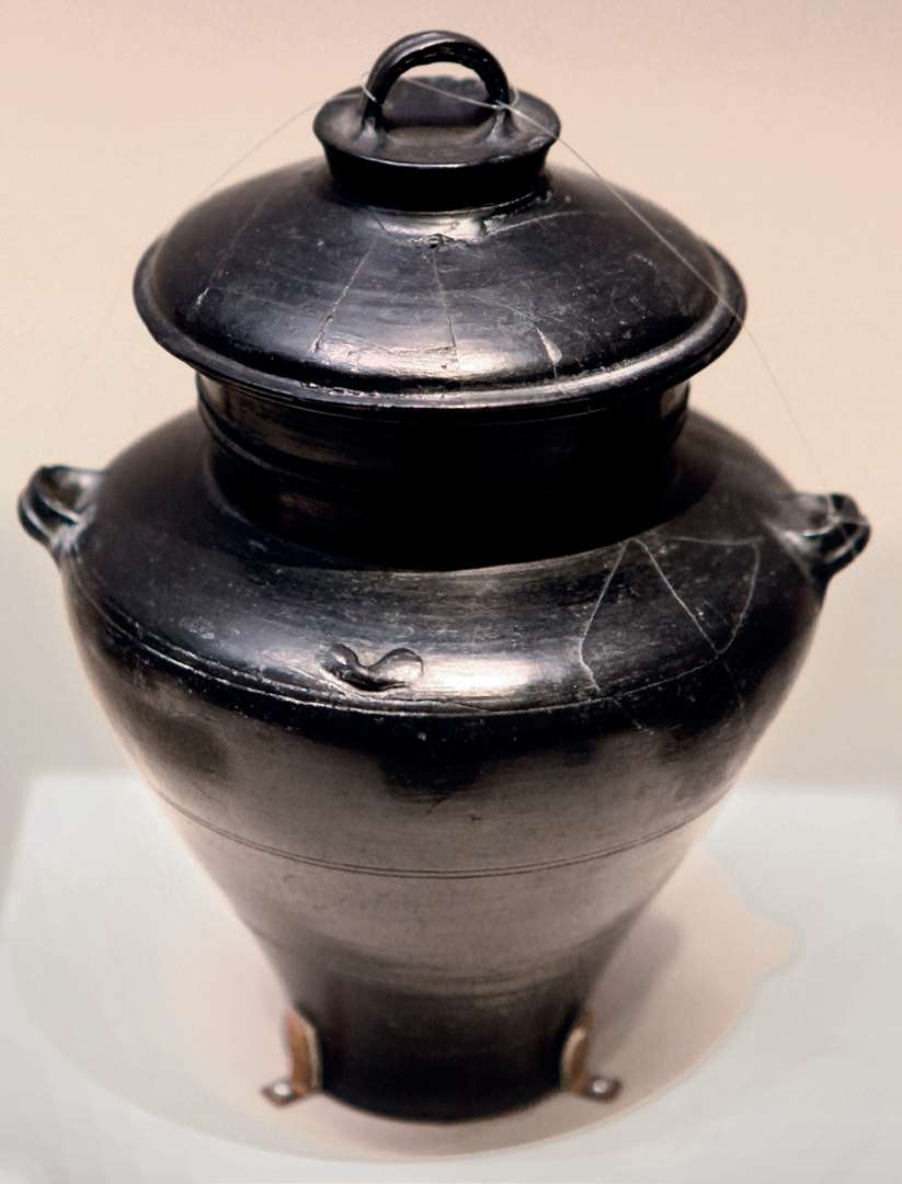 黑陶在烧制时采用了封窑烟熏的渗炭方法,器表呈现出黑色光泽。黑陶表面磨光,朴素无华,纹饰仅有少数弦纹、划纹或镂孔。黑、薄、光、纽为其四大特点。