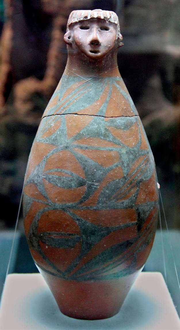 其彩陶器造型优美,表面用红彩或黑彩画出绚丽多彩的几何形图案和动物形花纹,其中人面形纹、鱼纹、鹿纹、蛙纹与鸟纹等形象逼真生动。