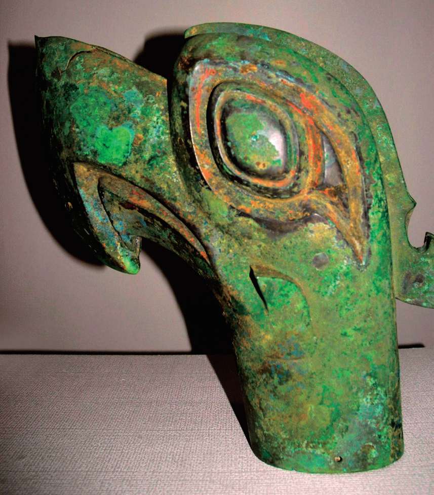 著名的青铜纵目面具代表的,其实是人鸟合体的一种正式表现形式。面具两个尖尖的耳朵,是杜鹃鸟的两只翅膀,它的钩啄般的鼻子则象征它是鹰隼一类的鸟。