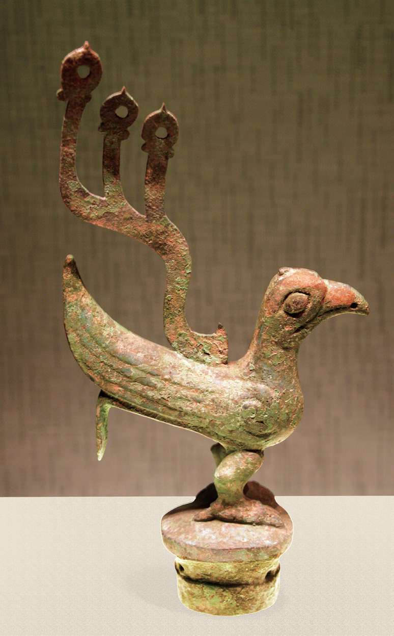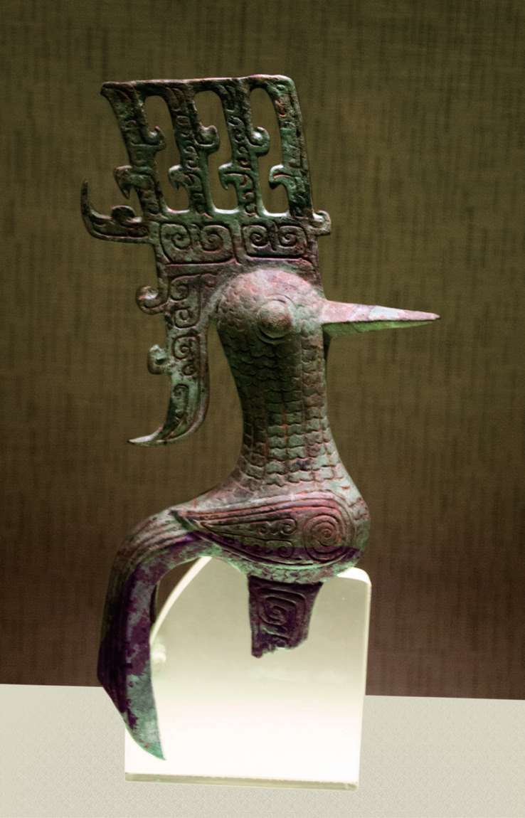 三星堆二号坑出土的众多铜器中,有许多鸟类造型。显然,这是三星堆人对鸟类产生的特殊情结。一方面,由于蜀地当时鸟类繁多,千姿百态,使蜀人引以为豪;另一方面,鸟类有灵活的翅膀,能够自由飞翔,甚至能上达碧霄,进入人类难以到达的境界,使人产生敬畏之情,甚至让人崇拜。