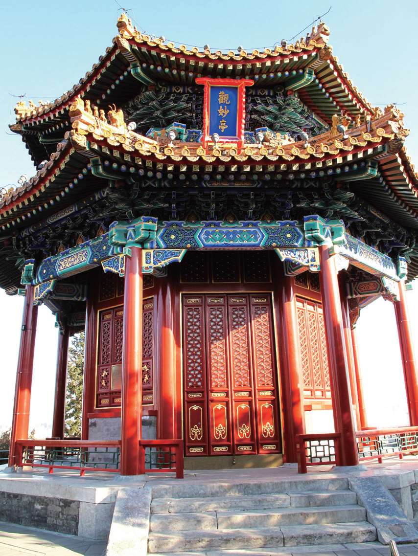景山的五方亭中,周赏亭和富览亭是圆亭子,观妙亭和缉芳亭是八角亭,而矗立于景山之巅的万春亭,是个占地面积最大的大方亭子,三重檐攒顶庑殿式的顶,金顶剪绿边,32根大红柱,与其他四个亭子相比较,属它气势最大,规制最高。