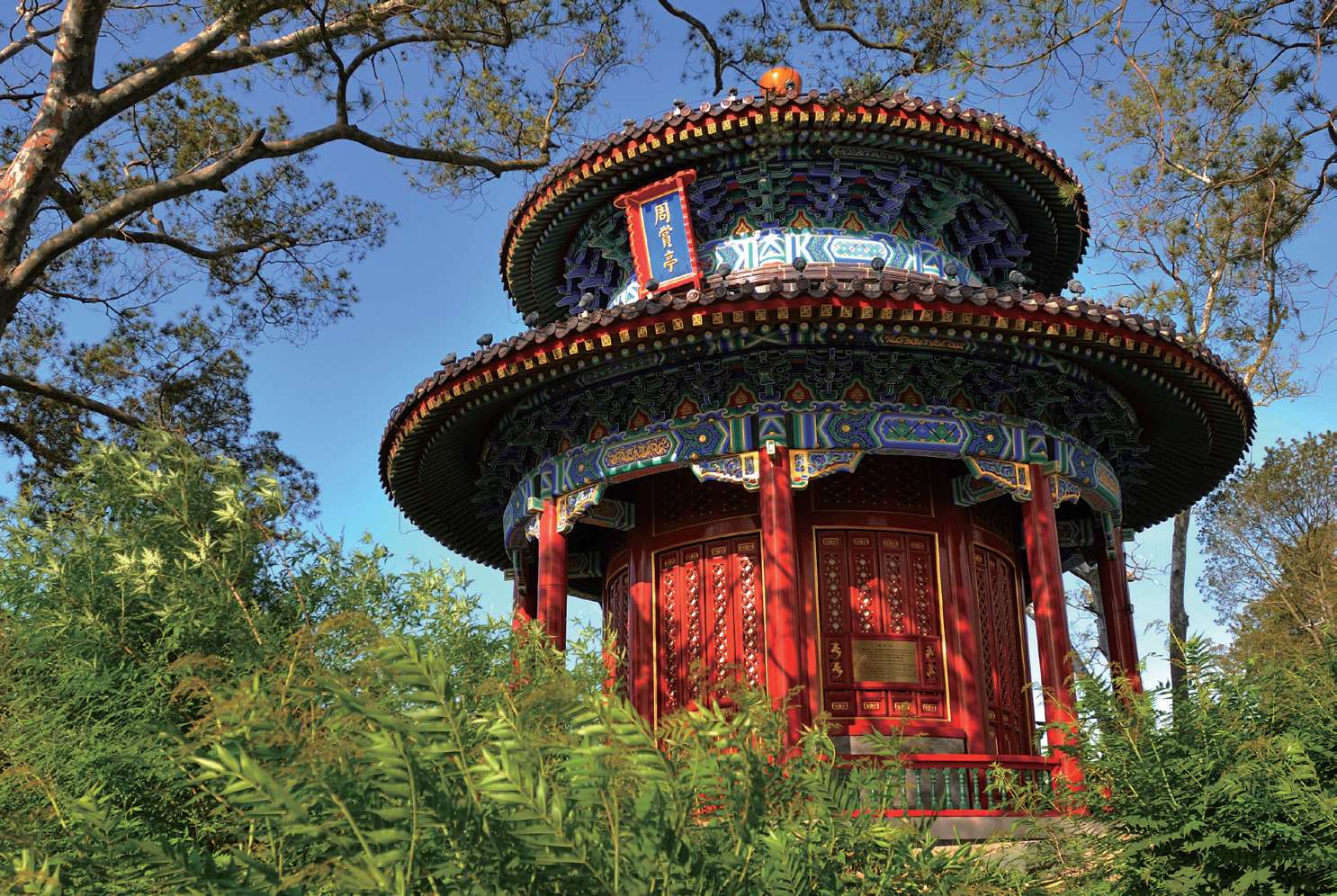 周赏亭是景山公园东侧第一座亭。孔雀蓝琉璃筒瓦顶,紫晶色琉璃瓦剪边,重檐圆攒尖顶。上檐为重昂七踩斗栱,下檐采用单昂五踩斗栱,两槽柱子,内外各有八根柱子支撑。