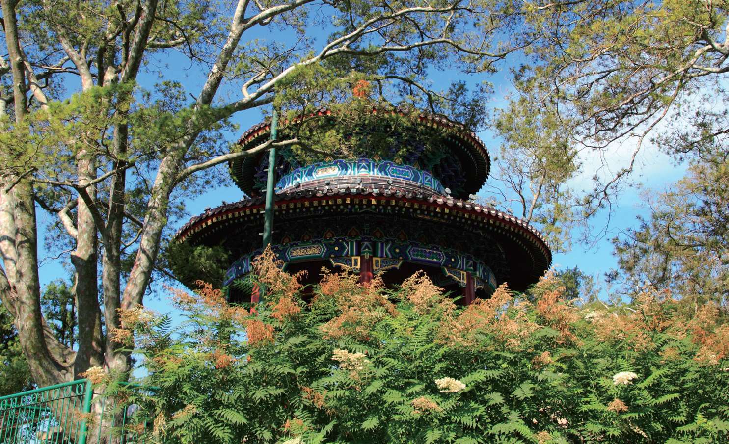 观妙亭是景山公园东侧第二座亭。翡翠绿琉璃筒瓦顶,黄琉璃筒瓦剪边,重檐八角攒尖式。上檐为重昂七踩斗栱,下檐为单昂五踩斗栱,两槽柱子,内外各有八根。
