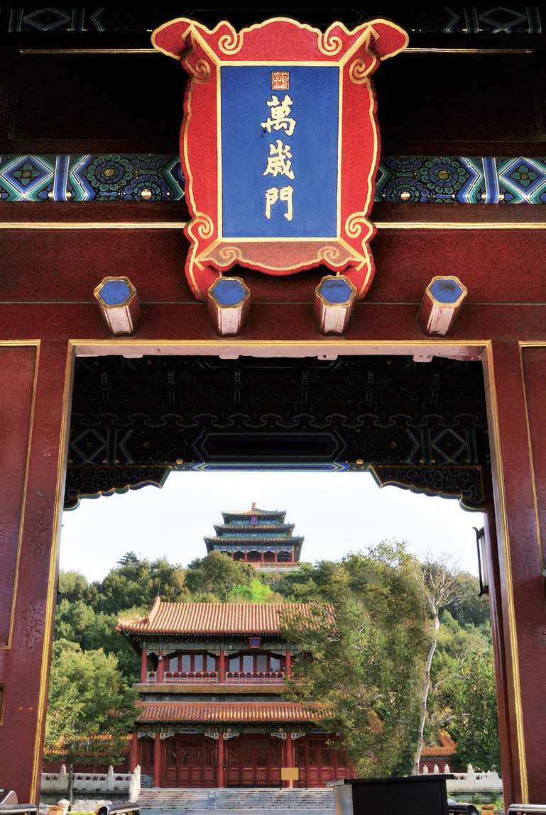 景山有三座山门,正门在明代称“万岁门”,清代称“景山门”。门上悬仿制的明代“万岁门”匾,上刻有“大明天子之宝”字样。