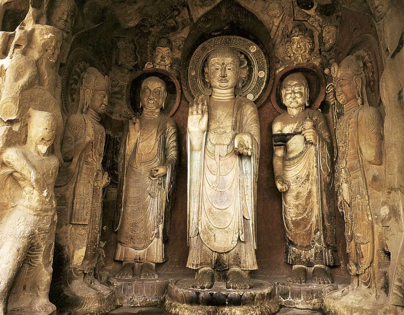 主佛左右侍立迦叶、阿傩二弟子。迦叶袒右肩,左手执香炉,右手握拳下垂;阿傩左手捻串珠,右手上举,拇指中指相并。外侧观音、大势至二位菩萨,也都刻得眉目清秀,端庄慈祥。左右护法、金刚、力士等造像,惜风雨剥蚀,已面目难辨,但所见一肢一臂,仍旧雄姿英发,形态不凡。