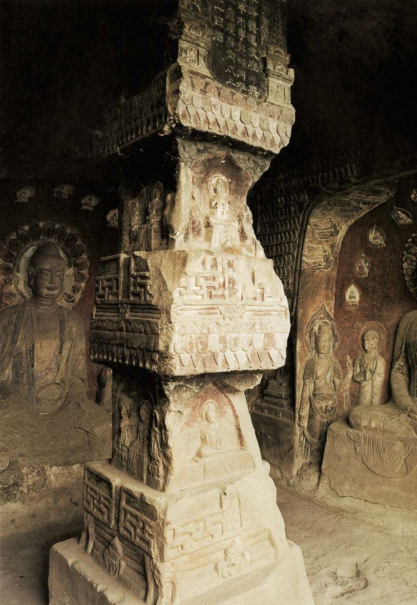 中心柱是一根完整的石柱,又是一座造型精美的经塔,由塔基、身、顶三部分组成。第一、第二层四面各凿一龛,龛中凿一佛二菩萨三尊像。这些佛龛造像,刻法古朴,坐佛褒衣从正面敞开,下缘垂于台座下;左右侍立菩萨,发作双髻,长裙曳地,阔幅天衣于胸前作“V”形交叉于双肩成双角若翼。