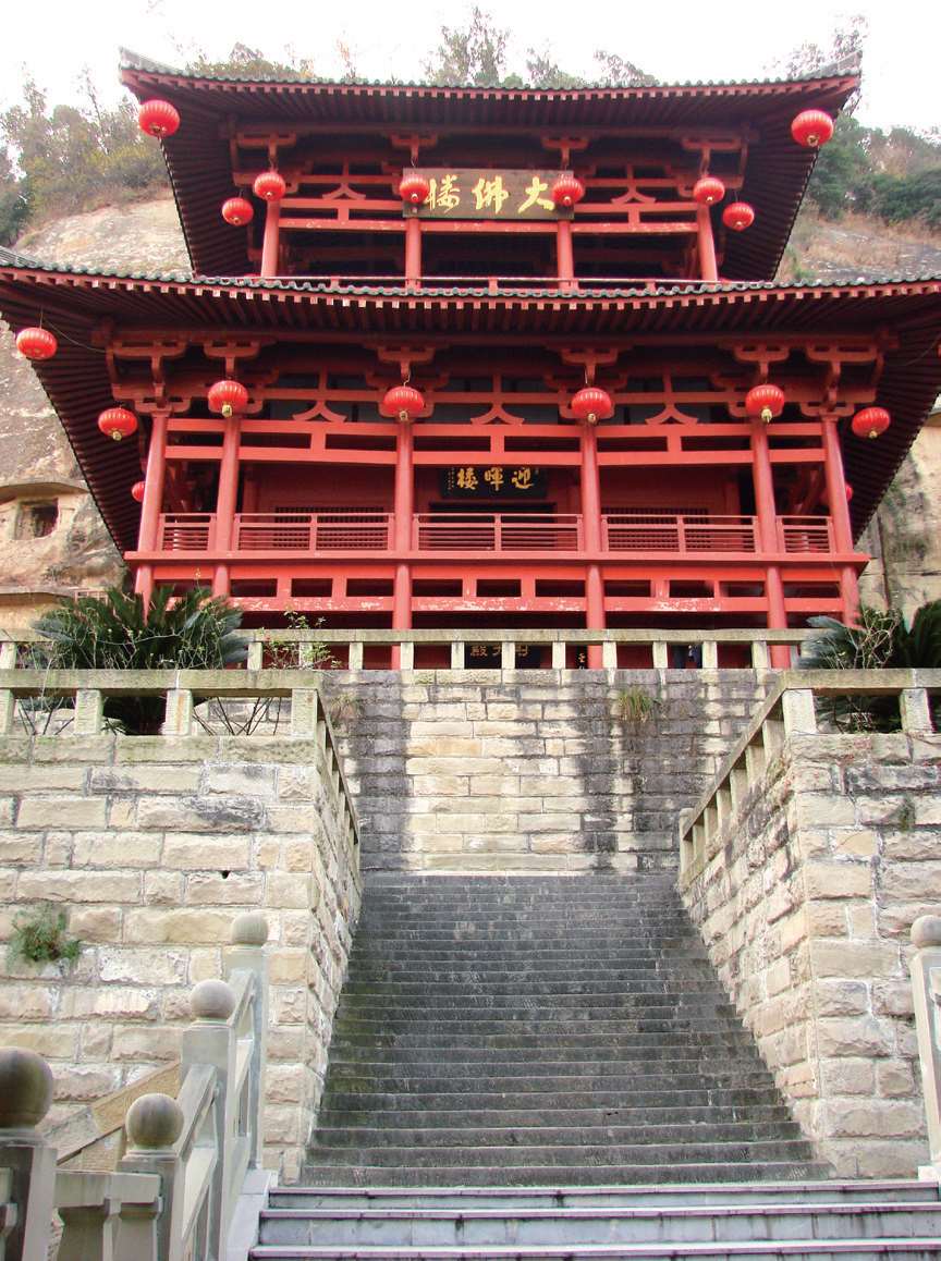 大佛楼又叫大佛石窟,原本无楼,是则天殿侧依山摩崖造像石窟。该楼初建于清代道光年间,后因年久失修已坍塌,后又重新建造,悬“大佛楼”三个字匾额于楼上,于是便习惯上称为“大佛楼”了。