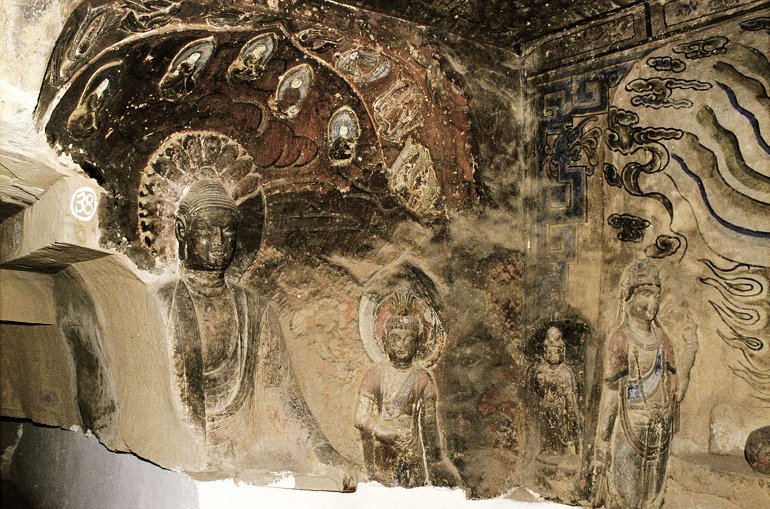 三面石壁上的三个大龛内,造一佛二弟子二菩萨,佛像均身躯颀长,菩萨则面颐丰润,通身无璎珞,造像坚挺有力,富于体积感。三壁上部饰千佛,但三个大龛内的造像为后代改凿。