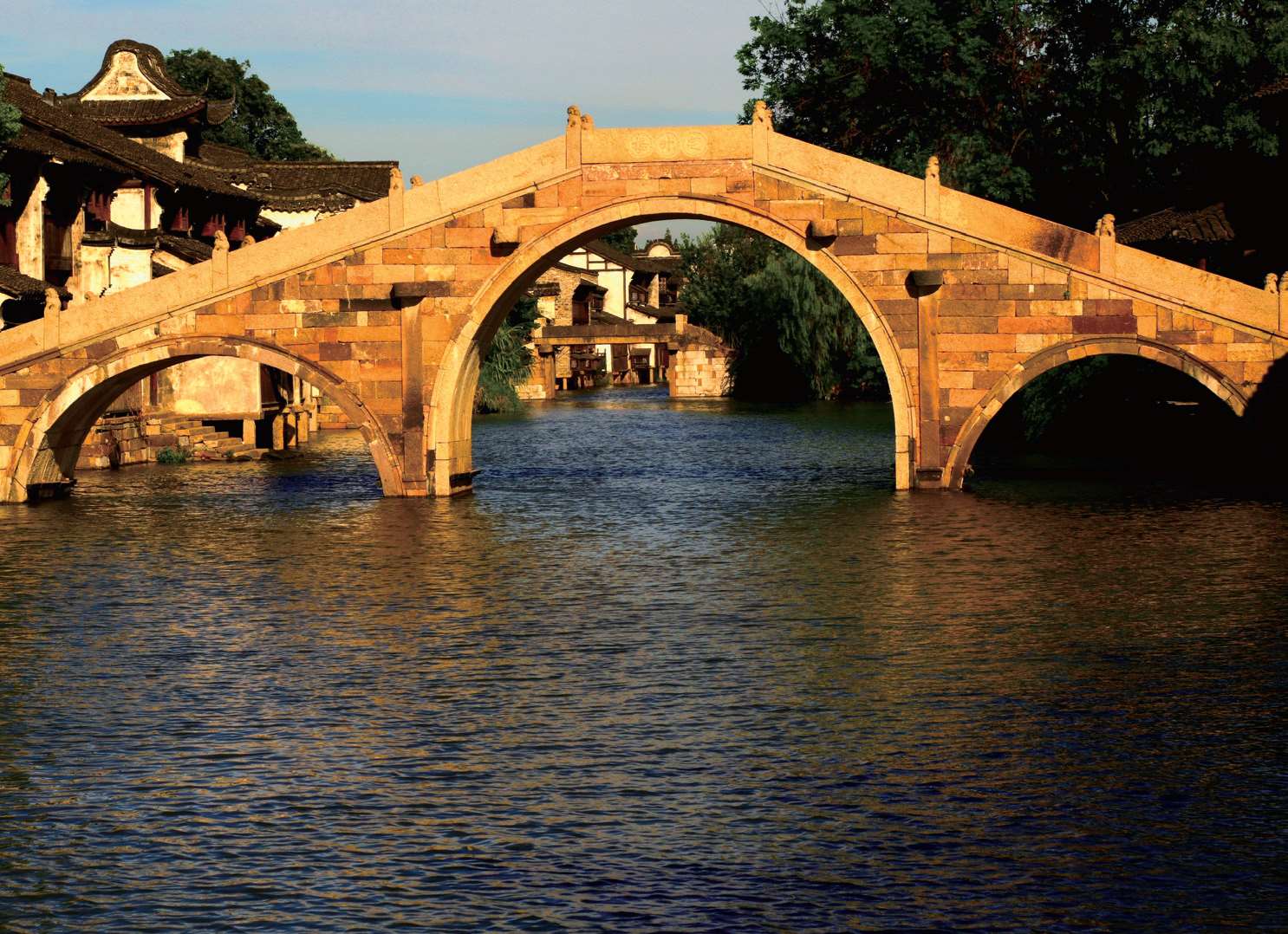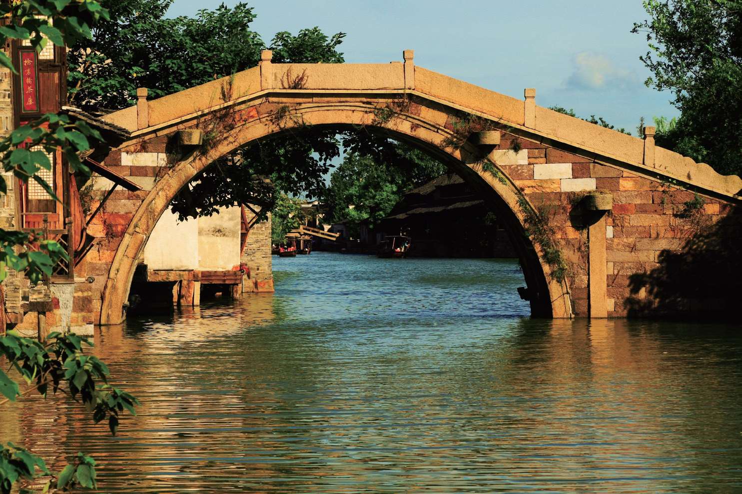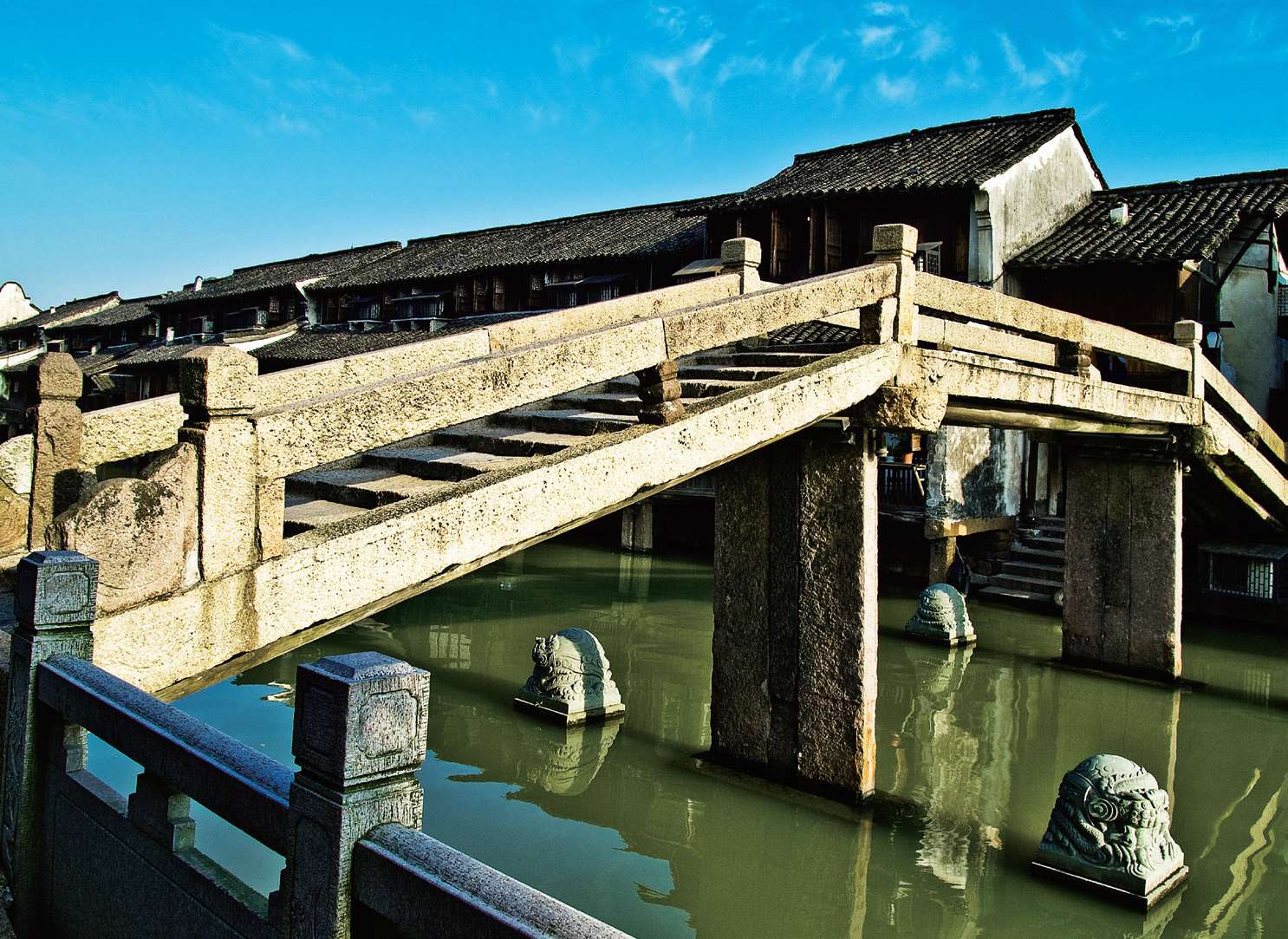 船到乌镇西栅日晖桥边,一位石佛对摇船的说:“船老兄,我要上岸小解,请行个方便,在此停靠片刻。”