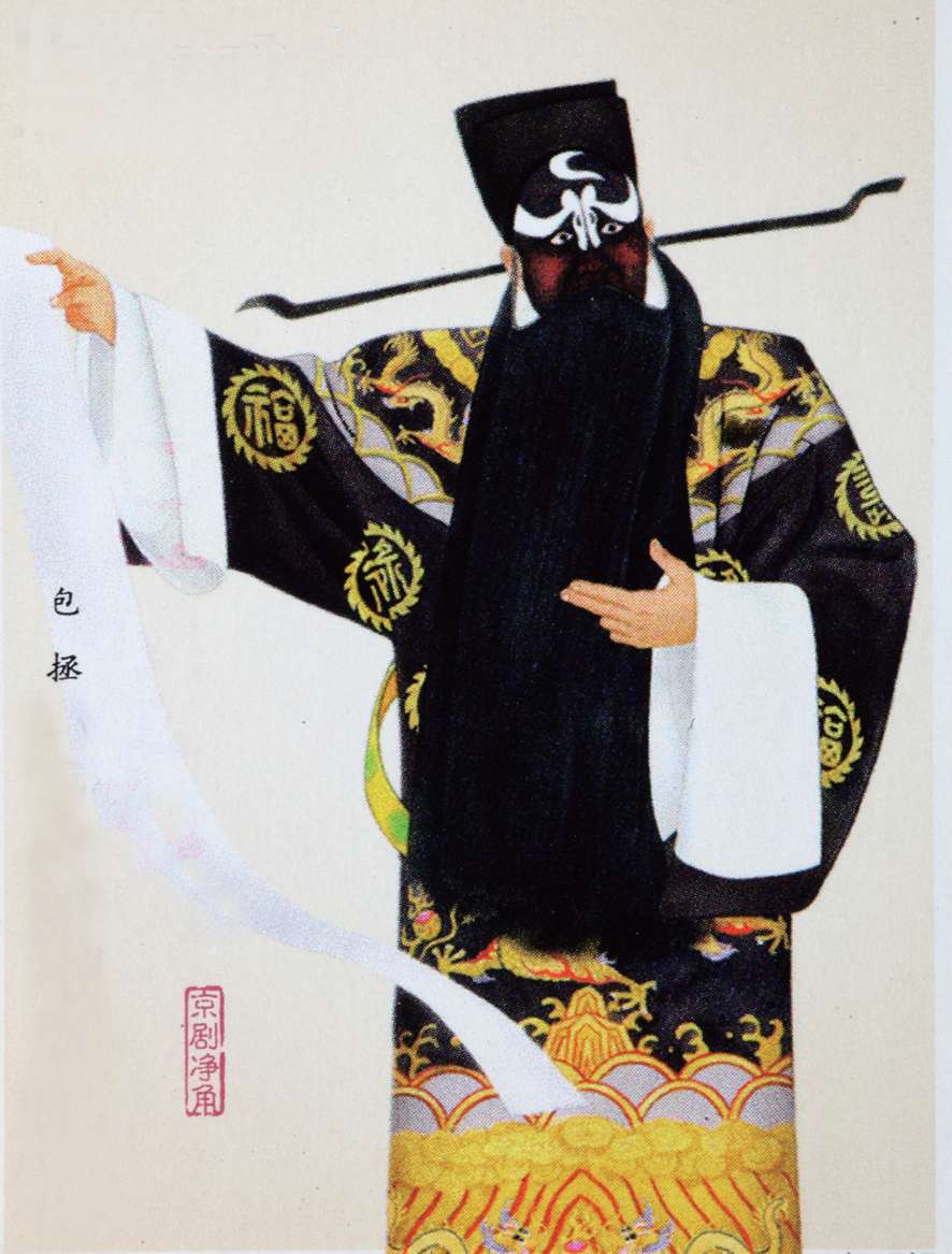 黑色脸在京剧脸谱种以武人为主,抹脸、揉脸中文人脸谱比较多,勾脸人物中一个最著名的文人就是包拯。包拯用黑脸,是因为传说中他脸色黝黑,从而又引申到表示铁面无私。包拯脑门上勾一月牙形花纹,一般说法是他能下阴曹地府断案。