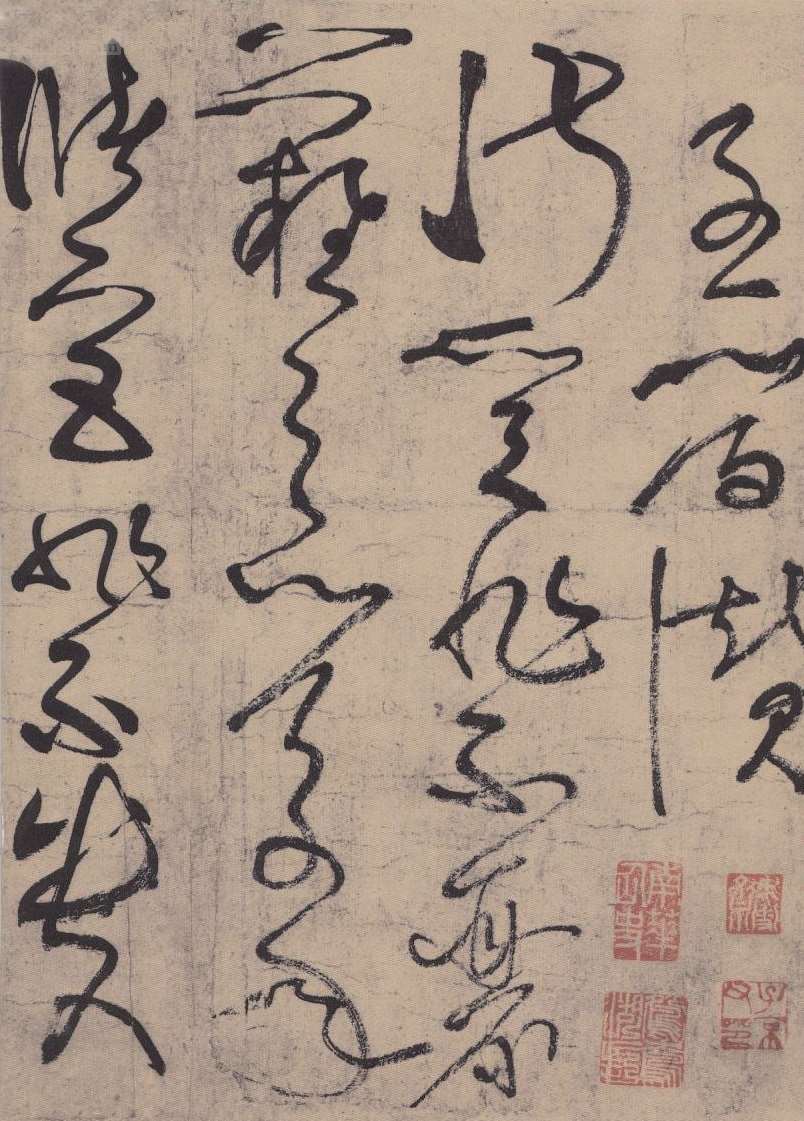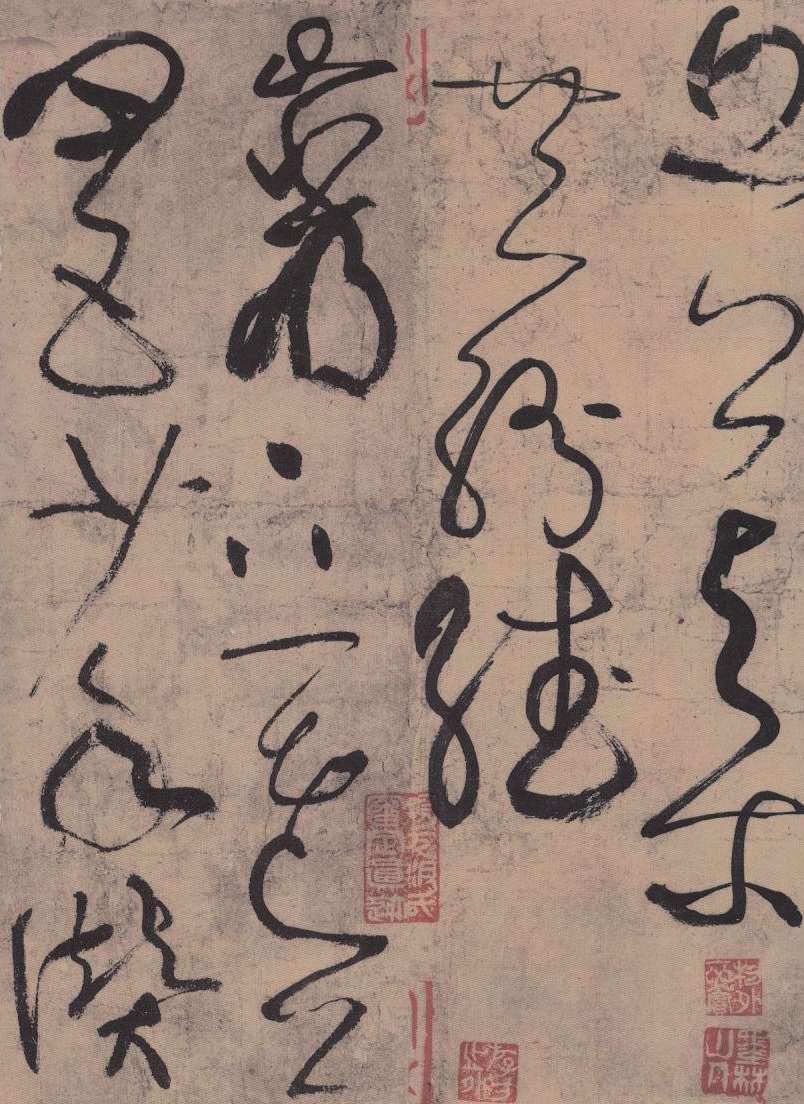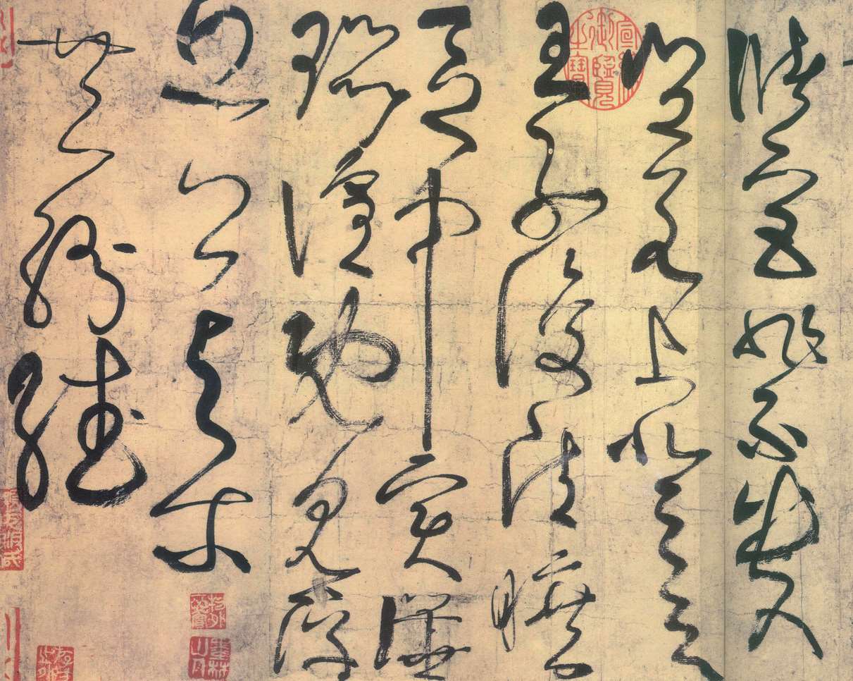 张旭把自然界和生活中的一切变化,凡有动于心,皆借变化多端以抒发之。草书之妙在于点画,而张旭在狂草中透露着点画的循规蹈矩,尤重提按、顿挫、牵丝等笔法,狂怪缭绕。
