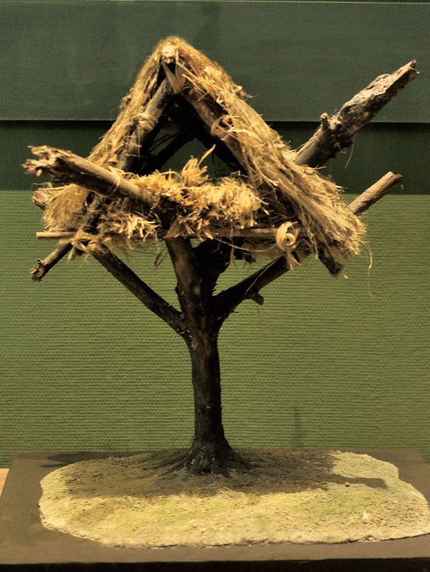 在南方有一个部落,其中有一个人受到鸟雀在树上搭窝的启发,就指导人们用树枝和藤条在高大的树干上建造房屋。房屋的四壁和屋顶都用树枝遮挡得严严实实,即挡风避雨,又可防止洪水冲淹,还可防止禽兽攻击,人们从此不再过那种担惊受怕的日子了。
