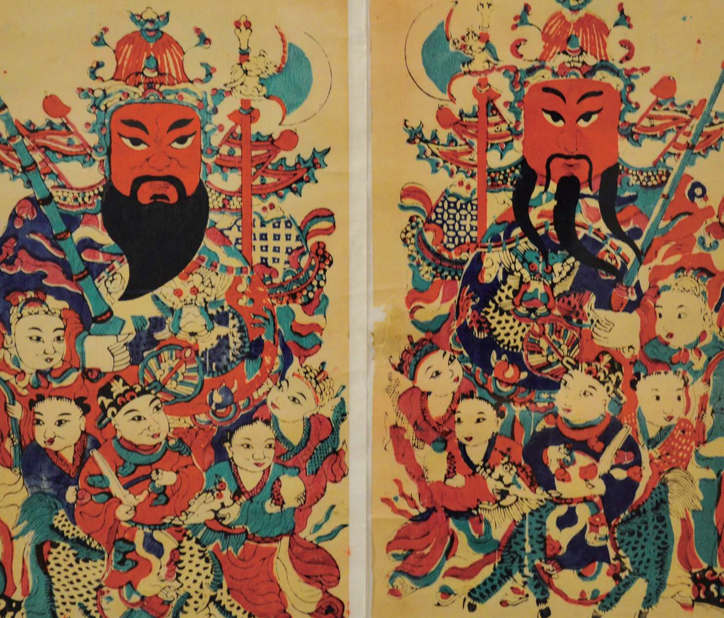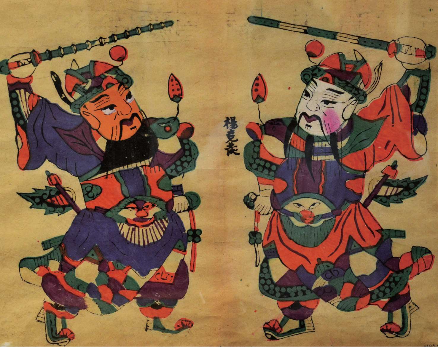 相传,秦琼和尉迟恭本是唐代皇帝李世民身边的两位将军,一次,李世民生病,听见门外鬼魅呼号,彻夜不得安宁。于是他让这两位将军手持武器立于门旁镇守,这天夜里就再也没有鬼魅骚扰了。