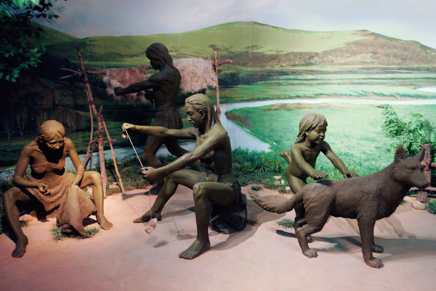 ■ 驯狗的原始人泥塑