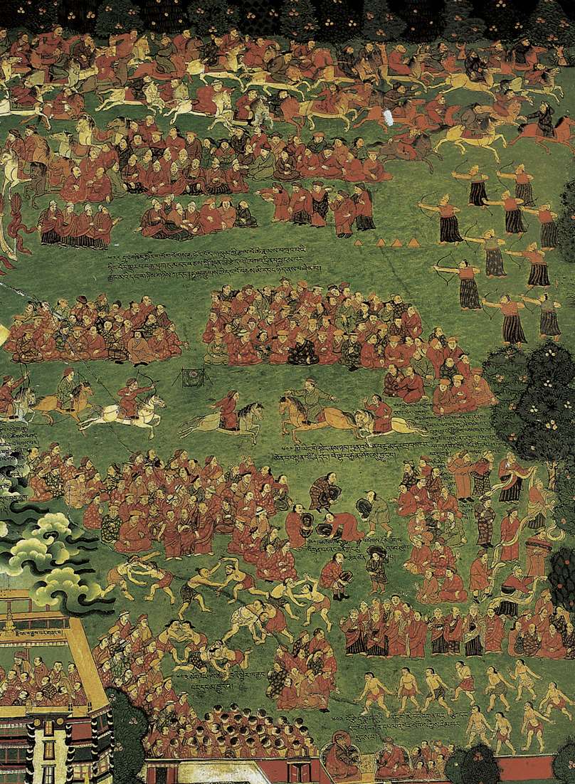 还有反映藏族民俗的《骑射图》,早在吐蕃时期,射箭已成为民间和官方的竞技比赛项目,它是男子应具备的9项技能之一。这9项技能是指文才、口才、算数、射箭、抛石、跳跃、跑步、游泳和摔跤。前3项为文类技能,后6项为武类技能。骑射比赛是要求骑手在规定的奔跑距离内,对箭靶任发数箭,以中环数的多少决定胜负和名次。