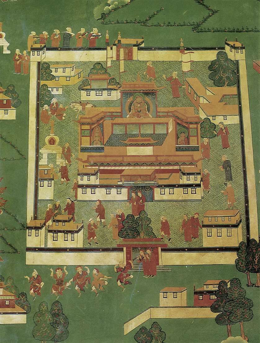 在白宫西日光殿福足欲聚宫所绘的五世达赖业迹图内采用了散点透视的技巧,整个画面用“之”字形布局,以山石、树木、行云、流水相间,使全图既独立成章又整体连贯。在西日光殿的福地妙旋宫的宝座后壁绘有苏坚尼布国王的故事图,其中就有采用平远透视构图绘成的小幅人物图。