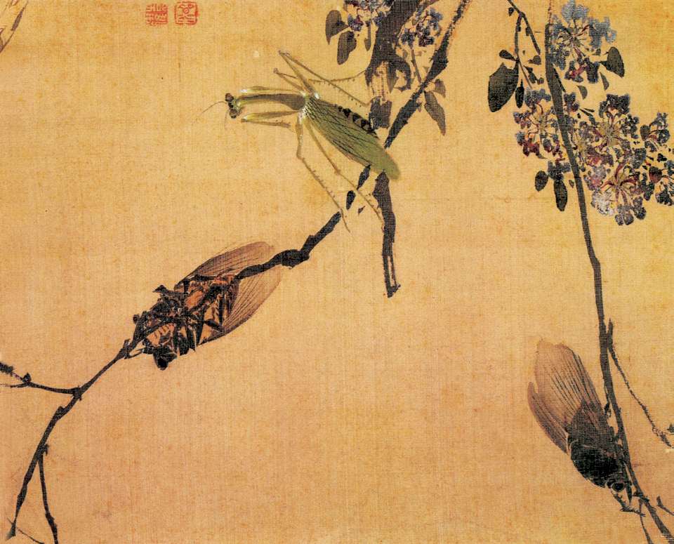 就在这刹那,有只螳螂借着树叶的隐蔽,伸出臂来一举而搏住蝉儿,螳螂意在捕蝉,见有所得而显露自己的形迹。而此时的异鹊乘螳螂捕蝉的时候,攫食螳螂。只是异鹊还不知道,它自己的性命也很危险。