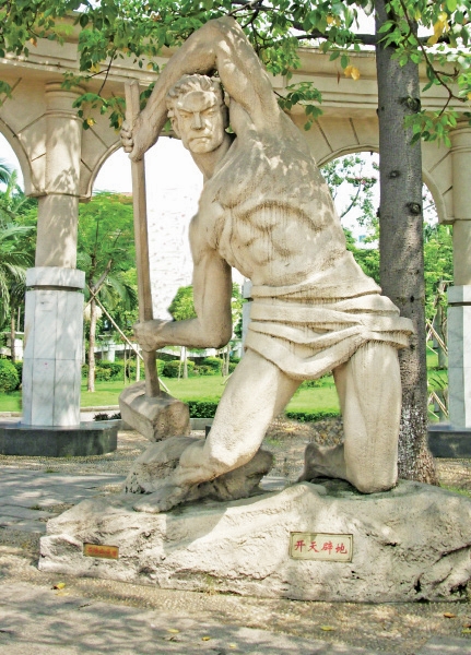 传说太古时代,天地不分,整个宇宙是一个中间有核的浑圆体,就像一个大鸡蛋,里面混沌一团,漆黑一片,既分不清上下左右,也辨不出东西南北。这个“鸡蛋”中孕育着一个伟大的英雄,他就是开天辟地创造人类世界的始祖盘古。