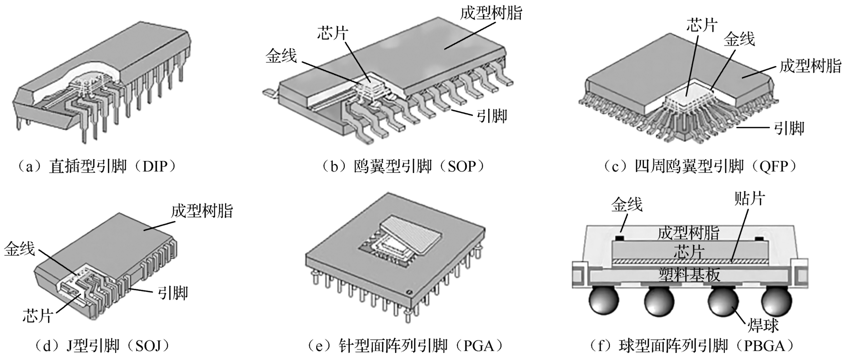 图2-1所示为部分不同引脚类型器件的封装结构和外形。器件的基本封装形式是将芯片黏结固定在基板上后,利用金线将其与外引脚或焊球互联,然后模压密封材料成型。其中图2-1(f)所示的封装结构中,还体现出了其使用塑料基板和芯片下衬底的细节。