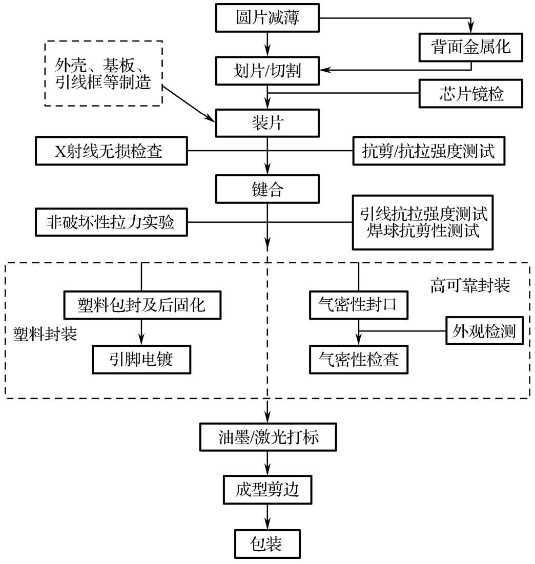 元器件封装形式与引脚类型各异,封装工艺也有差异,但就其基本工艺流程抽象归纳而言是相同或接近的,如图2-2所示。图中虚线部分给出了塑料封装工艺流程与高可靠性封装工艺流程的差异,其主要差别是密封方法不同。