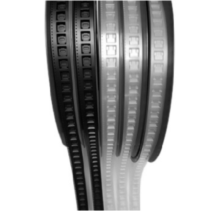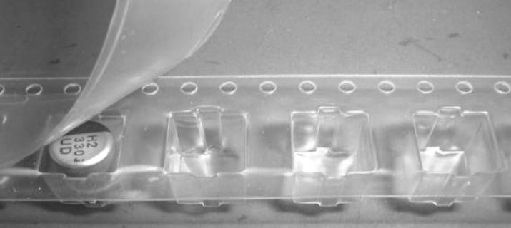 塑料编带由附有料盒的载带和薄膜盖组成。载带和料盒是一次模塑成型的,其尺寸精度高,编带方式比纸编带简便。在包装时,由专用供料装置,将元器件依次排列后逐一编入载带内,然后贴上盖带卷绕在带盘上。为防止静电使元器件受损或影响贴装,通常事先在塑料载带的基材内添加某些有机填料。