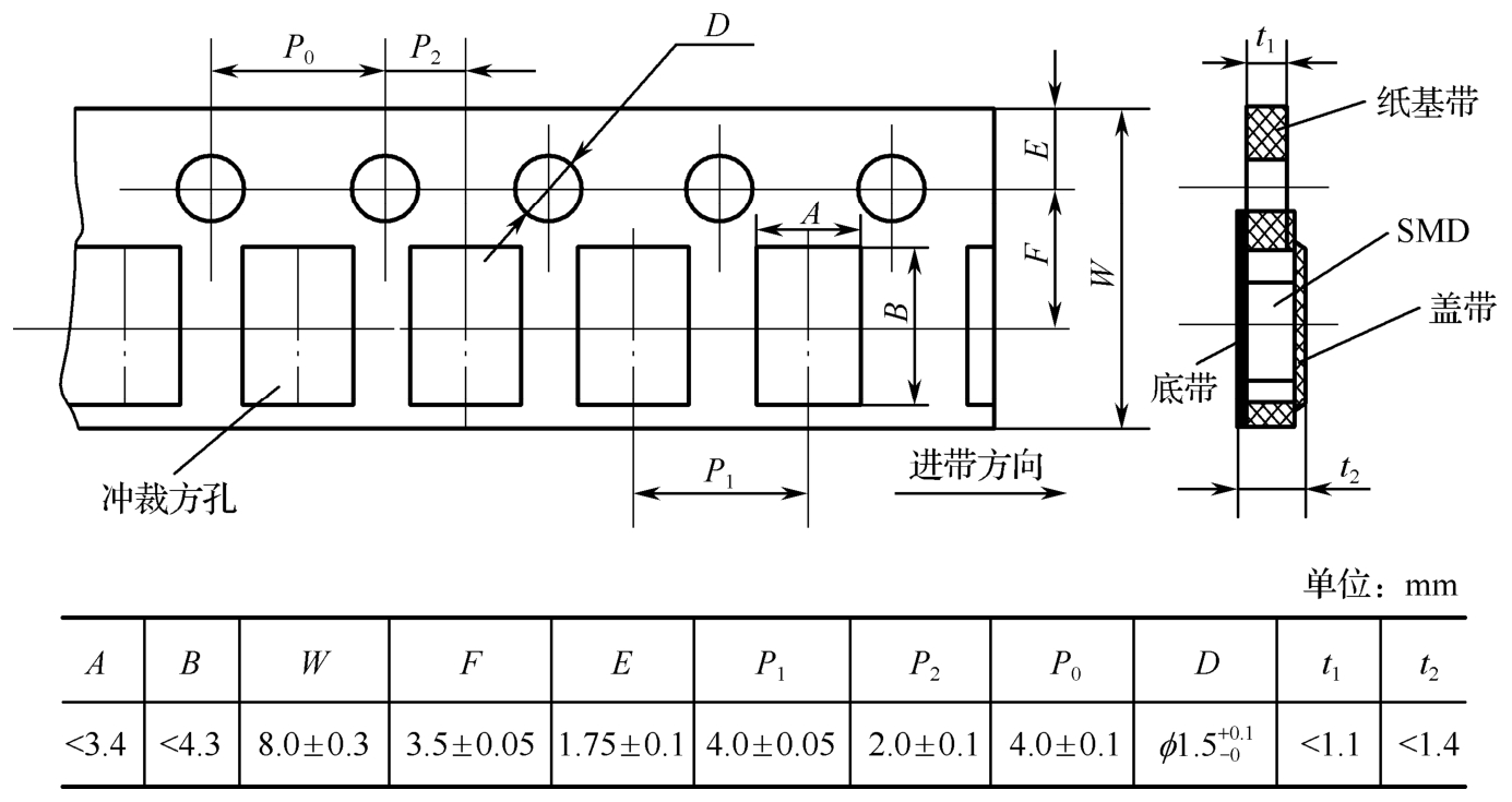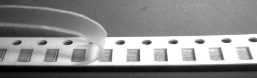 纸编带由基带、纸带和盖带组成(见图2-55和图2-56),是使用较多的一种编带。带上的小圆孔是进给定位孔。矩形孔是片式元器件的定位孔,也是承料腔,其尺寸由元器件外形尺寸而定。纸编带的成本低,适合高速贴装机使用。大多数片式电阻、片式瓷介电容包装都用这种编带。