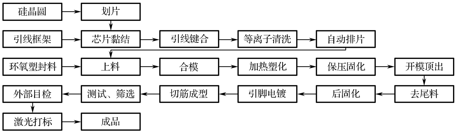 此外,在注塑工序前,需要进行等离子清洗,目的是清除前道工序对框架或芯片产生的沾污和氧化,降低塑封元器件在封装后,出现内部气孔或界面分层的不良现象。由于在该封装工艺过程中,塑封料的固化是由外向内进行的,短时间无法使其完全固化,因此在开模顶出后,需要进行后固化处理,通常的处理方式是在恒温175℃的烘箱中放置6h以上。