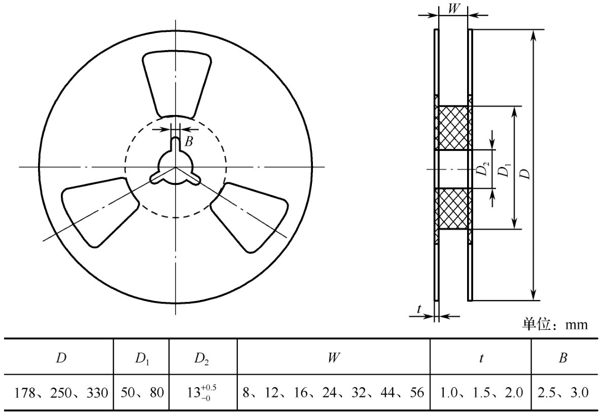 编带盘主要有纸质带盘和塑料带盘两种,如图2-60所示。纸质带盘结构简单、成本低,常用来包装(卷绕)圆柱形的元器件。它由纸板冲成两盘片,和塑料轴心黏结成带盘。塑料带盘的使用场合与纸质带盘基本相同。带盘的尺寸除前述常用的 φ 178mm、 φ 330mm之外,还可使用 φ 250mm、 φ 360mm等尺寸。带盘尺寸如图2-61所示。