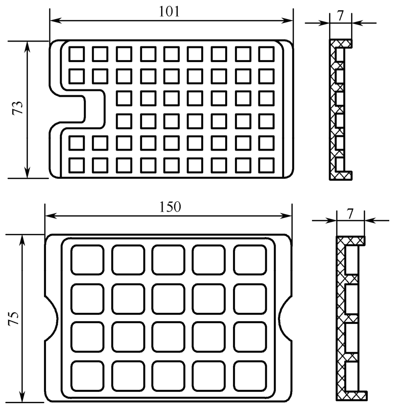 托盘包装的托盘有硬盘和软盘两种。硬盘常用来包装多引线、细间距的QFP元器件,这样封装体引出线不易变形。软盘则用来包装普通的异形片式元器件。托盘包装尺寸示例如图2-65所示。