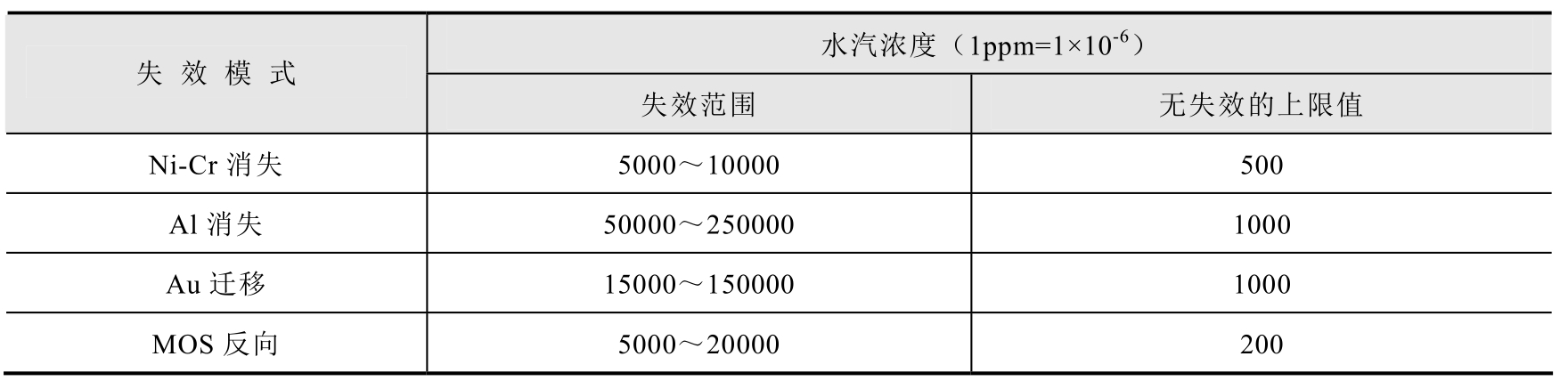 对绝大多数电子元器件而言,密封主要是为了防止潮气渗透和氧气扩散,也有部分密封是为了保持真空或高压状态。潮气是引起元器件失效的主要原因,常导致金属-氧化物半导体(MOS)元器件中的电荷泄漏、金属化的腐蚀(原电池效应)、电解导电(水汽含量大于1.5%时)等失效现象的产生。表2-3所示为在环境温度100℃条件下测试得到的元器件失效与水汽的浓度关系。在一般情况下,采用气密性封帽技术可使元器件内部水汽浓度小于5000ppm,则可避免上述失效现象的发生。氧气是含锡等抗氧化性弱的焊料引起元器件焊接强度下降,导致失效的主要原因之一,为此防止氧气扩散也是必需的。
